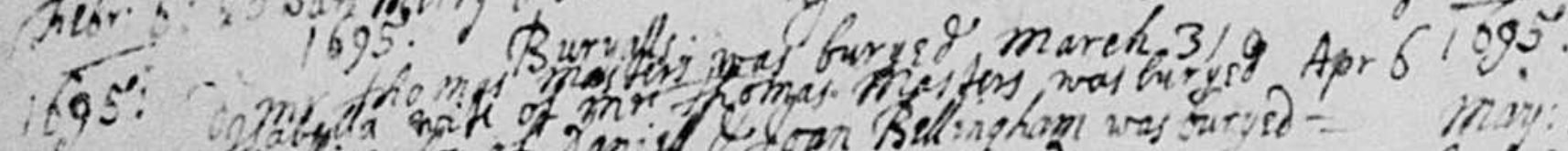 Before the change from the Julian to the Gregorian calendar in 1752 the legal start of the year was 25th March (6th April in the new calendar). This means that there can be some confusion in 17th/18th century dates during the early part of a year as to which year in the modern style is meant. Possibly there was some confusion about the date for the start of the year, thinking it was 1st April, if so we have Thomas died 28th March 1695 and was buried on Saturday the 31st March 1695 with Isabella dying 3rd April 1696 and was buried on Friday the 6th April 1696, apparently the year after! We see their burials on previous page (1695) clearly inserted. So this may well explain why they are both in the registers twice, with the 1696 entry crossed out. At least we know what is going on. The dates! They both die within six days of each other, Thomas first. They are then buried within six days of each other. Not sure what to make of this. |
