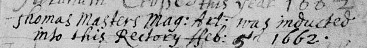 We now see Thomas Masters being Instituted as Rector on Tuesday the 3rd February 1663 at St Michael & All Angels, Tatenhill, Staffs. [LRO, B/A/1/17 (Register)], [LRO, B/V/1/67 (Liber Cleri)], [LRO, B/A/4/3 (Subscription Book)]. This was noted in the parish registrars as his induction. In a record of Friday the 4th August 1665 we see Thomas Masters was a licensed preacher. The Rectory valued at 140 p.a. [LRO, B/V/1/67 (Liber Cleri)]. 140 in 1665, in today's money would be at least equal to 39,714. |