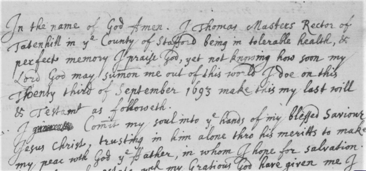 Thomas Masters died aged seventy one on Wednesday the 28th March 1696 and was buried on Saturday the 31st March 1696. Although in the CCed his death was given as on Saturday the 2nd May 1696. [LRO, B/A/1/18 (Register)], it is likely the CCEd record is incorrect. It would be interesting to consult the record referred to [B/A/1/18], as these records are not usually incorrect. Note the references to Lichfield RO or LRO. This is now closed and all records have gone to Stafford County Records Office [SRO]. Note the spelling of the word burials, with a y. |